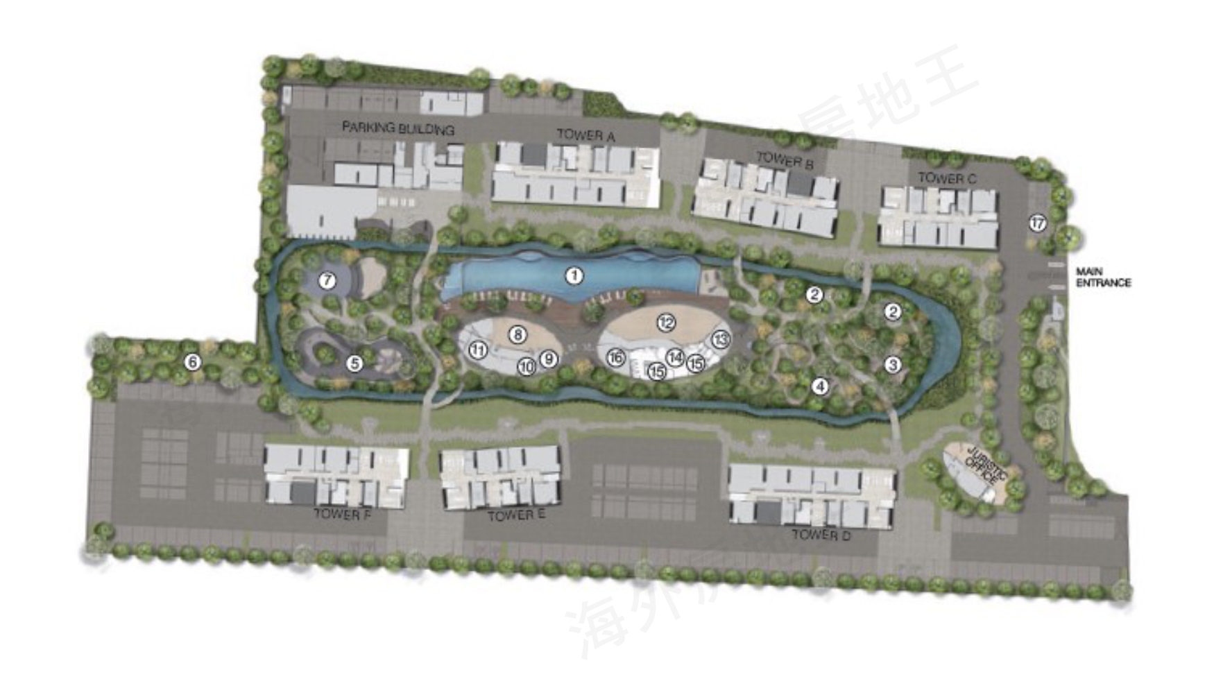 大堂/綠洲健身中心/中央公園森林空間/觀景台/綠意公園/互動草坪/寵物公園/籃球場與攀岩區/池畔共享廚房/洗衣房/影視劇場/遊戲室/桑拿與蒸汽浴室/孩童空間/瑜伽室/郵箱室
