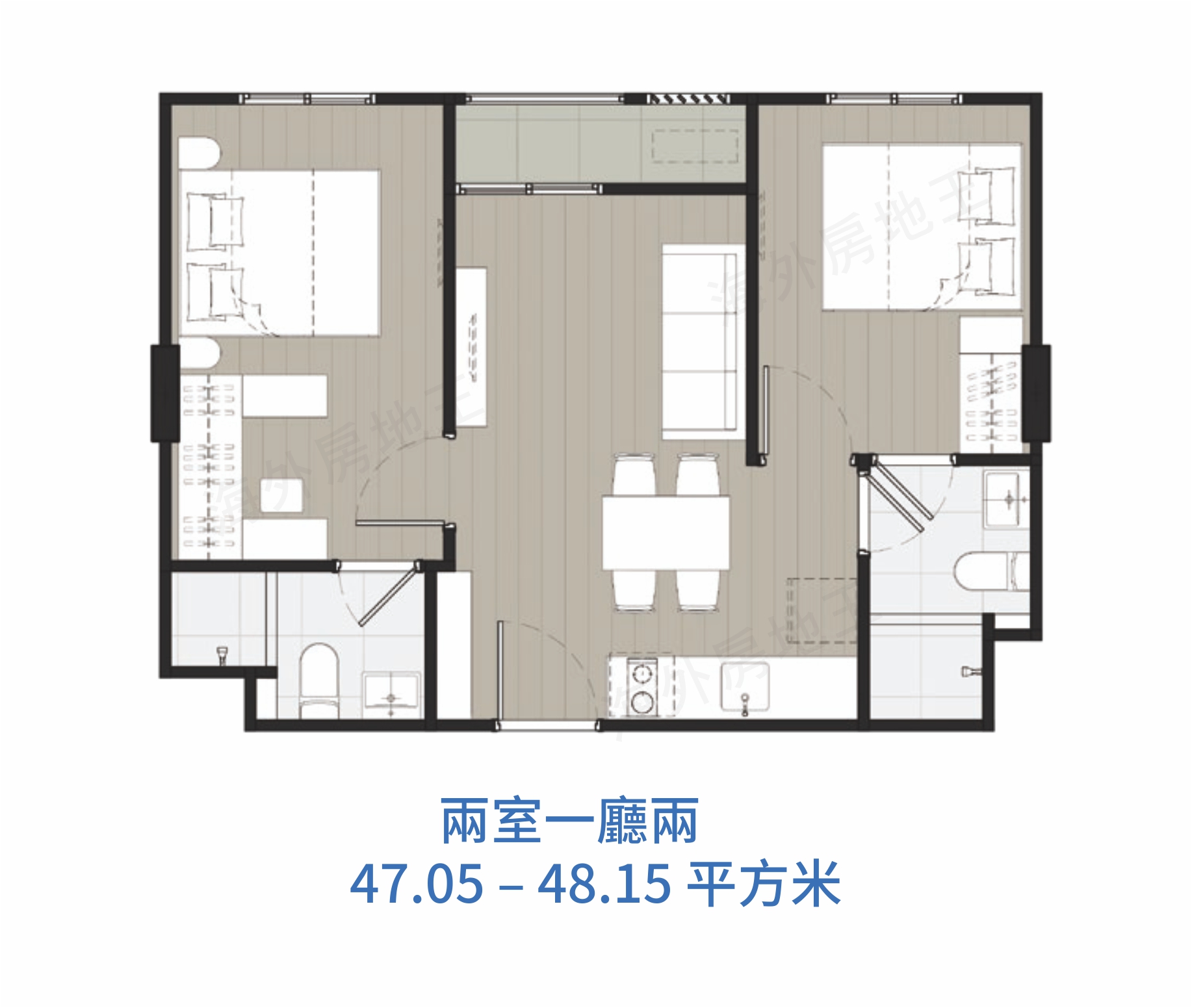 兩室一廳兩衛:47.05 – 48.15 平方公尺